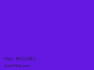 Hex #6518e1 Color is a normal violet color and the nearest color is Han Purple #5218fa. Hex code #6518e1 and RGB value is rgb(101,24,225). In RGB color space, this color is composed of 40% red, 9% green, 88% blue, In CMYK color space, this color is composed of 55% cyan, 89% magenta, 0% yellow , 12% black , In HSL color space, this color has a hue angle of 263° , 81% saturation and 49% lightness.