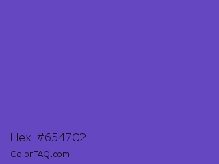 Hex #6547c2 Color is a normal indigo color and the nearest color is Blue Violet #6456b7. Hex code #6547c2 and RGB value is rgb(101,71,194). In RGB color space, this color is composed of 40% red, 28% green, 76% blue, In CMYK color space, this color is composed of 48% cyan, 63% magenta, 0% yellow , 24% black , In HSL color space, this color has a hue angle of 255° , 50% saturation and 52% lightness.