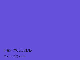 Hex #6550db Color is a normal indigo color and the nearest color is Majorelle Blue #6050dc. Hex code #6550db and RGB value is rgb(101,80,219). In RGB color space, this color is composed of 40% red, 31% green, 86% blue, In CMYK color space, this color is composed of 54% cyan, 63% magenta, 0% yellow , 14% black , In HSL color space, this color has a hue angle of 249° , 66% saturation and 59% lightness.