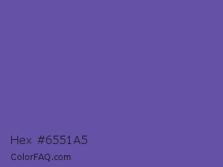 Hex #6551a5 Color is a normal indigo color and the nearest color is Butterfly Bush #624e9a. Hex code #6551a5 and RGB value is rgb(101,81,165). In RGB color space, this color is composed of 40% red, 32% green, 65% blue, In CMYK color space, this color is composed of 39% cyan, 51% magenta, 0% yellow , 35% black , In HSL color space, this color has a hue angle of 254° , 34% saturation and 48% lightness.