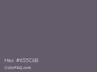 Hex #655c6b Color is a normal purple color and the nearest color is Salt Box #685e6e. Hex code #655c6b and RGB value is rgb(101,92,107). In RGB color space, this color is composed of 40% red, 36% green, 42% blue, In CMYK color space, this color is composed of 6% cyan, 14% magenta, 0% yellow , 58% black , In HSL color space, this color has a hue angle of 276° , 8% saturation and 39% lightness.