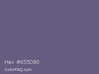 Hex #655d80 Color is a normal indigo color and the nearest color is Dolphin #646077. Hex code #655d80 and RGB value is rgb(101,93,128). In RGB color space, this color is composed of 40% red, 36% green, 50% blue, In CMYK color space, this color is composed of 21% cyan, 27% magenta, 0% yellow , 50% black , In HSL color space, this color has a hue angle of 254° , 16% saturation and 43% lightness.