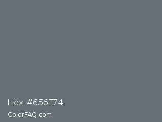 Hex #656f74 Color is a normal blue color and the nearest color is Nevada #646e75. Hex code #656f74 and RGB value is rgb(101,111,116). In RGB color space, this color is composed of 40% red, 44% green, 45% blue, In CMYK color space, this color is composed of 13% cyan, 4% magenta, 0% yellow , 55% black , In HSL color space, this color has a hue angle of 200° , 7% saturation and 43% lightness.