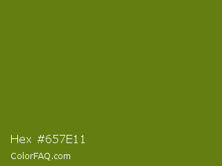 Hex #657e11 Color is a dark lime color and the nearest color is Fern Frond #657220. Hex code #657e11 and RGB value is rgb(101,126,17). In RGB color space, this color is composed of 40% red, 49% green, 7% blue, In CMYK color space, this color is composed of 20% cyan, 0% magenta, 87% yellow , 51% black , In HSL color space, this color has a hue angle of 74° , 76% saturation and 28% lightness.