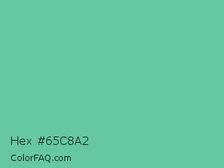 Hex #65c8a2 Color is a normal green color and the nearest color is Medium Aquamarine #66ddaa. Hex code #65c8a2 and RGB value is rgb(101,200,162). In RGB color space, this color is composed of 40% red, 78% green, 64% blue, In CMYK color space, this color is composed of 50% cyan, 0% magenta, 19% yellow , 22% black , In HSL color space, this color has a hue angle of 157° , 47% saturation and 59% lightness.