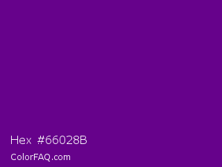 Hex #66028b Color is a dark purple color and the nearest color is Purple #660099. Hex code #66028b and RGB value is rgb(102,2,139). In RGB color space, this color is composed of 40% red, 1% green, 55% blue, In CMYK color space, this color is composed of 27% cyan, 99% magenta, 0% yellow , 45% black , In HSL color space, this color has a hue angle of 284° , 97% saturation and 28% lightness.