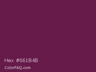 Hex #661b4b Color is a dark magenta color and the nearest color is Tawny Port #692545. Hex code #661b4b and RGB value is rgb(102,27,75). In RGB color space, this color is composed of 40% red, 11% green, 29% blue, In CMYK color space, this color is composed of 0% cyan, 74% magenta, 26% yellow , 60% black , In HSL color space, this color has a hue angle of 322° , 58% saturation and 25% lightness.