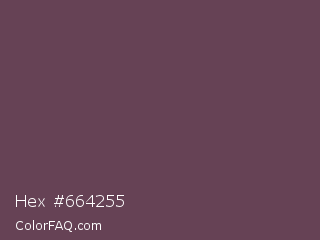 Hex #664255 Color is a normal rose color and the nearest color is Eggplant #614051. Hex code #664255 and RGB value is rgb(102,66,85). In RGB color space, this color is composed of 40% red, 26% green, 33% blue, In CMYK color space, this color is composed of 0% cyan, 35% magenta, 17% yellow , 60% black , In HSL color space, this color has a hue angle of 328° , 21% saturation and 33% lightness.