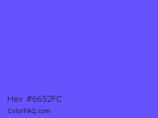 Hex #6652fc Color is a light indigo color and the nearest color is Very Light Blue #6666ff. Hex code #6652fc and RGB value is rgb(102,82,252). In RGB color space, this color is composed of 40% red, 32% green, 99% blue, In CMYK color space, this color is composed of 60% cyan, 67% magenta, 0% yellow , 1% black , In HSL color space, this color has a hue angle of 247° , 97% saturation and 65% lightness.
