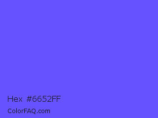 Hex #6652ff Color is a light indigo color and the nearest color is Very Light Blue #6666ff. Hex code #6652ff and RGB value is rgb(102,82,255). In RGB color space, this color is composed of 40% red, 32% green, 100% blue, In CMYK color space, this color is composed of 60% cyan, 68% magenta, 0% yellow , 0% black , In HSL color space, this color has a hue angle of 247° , 100% saturation and 66% lightness.