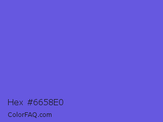 Hex #6658e0 Color is a light indigo color and the nearest color is Majorelle Blue #6050dc. Hex code #6658e0 and RGB value is rgb(102,88,224). In RGB color space, this color is composed of 40% red, 35% green, 88% blue, In CMYK color space, this color is composed of 54% cyan, 61% magenta, 0% yellow , 12% black , In HSL color space, this color has a hue angle of 246° , 69% saturation and 61% lightness.