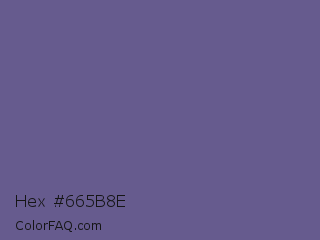 Hex #665b8e Color is a normal indigo color and the nearest color is Dark Blue Gray #666699. Hex code #665b8e and RGB value is rgb(102,91,142). In RGB color space, this color is composed of 40% red, 36% green, 56% blue, In CMYK color space, this color is composed of 28% cyan, 36% magenta, 0% yellow , 44% black , In HSL color space, this color has a hue angle of 253° , 22% saturation and 46% lightness.