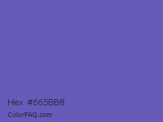Hex #665bb8 Color is a normal indigo color and the nearest color is Blue Violet #6456b7. Hex code #665bb8 and RGB value is rgb(102,91,184). In RGB color space, this color is composed of 40% red, 36% green, 72% blue, In CMYK color space, this color is composed of 45% cyan, 51% magenta, 0% yellow , 28% black , In HSL color space, this color has a hue angle of 247° , 40% saturation and 54% lightness.