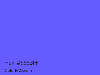 Hex #665bff Color is a light indigo color and the nearest color is Very Light Blue #6666ff. Hex code #665bff and RGB value is rgb(102,91,255). In RGB color space, this color is composed of 40% red, 36% green, 100% blue, In CMYK color space, this color is composed of 60% cyan, 64% magenta, 0% yellow , 0% black , In HSL color space, this color has a hue angle of 244° , 100% saturation and 68% lightness.