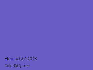 Hex #665cc3 Color is a normal indigo color and the nearest color is Slate Blue #6a5acd. Hex code #665cc3 and RGB value is rgb(102,92,195). In RGB color space, this color is composed of 40% red, 36% green, 76% blue, In CMYK color space, this color is composed of 48% cyan, 53% magenta, 0% yellow , 24% black , In HSL color space, this color has a hue angle of 246° , 46% saturation and 56% lightness.