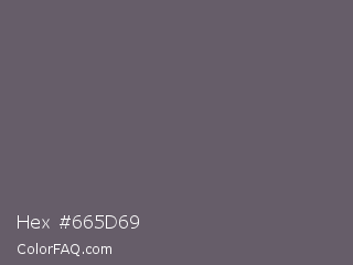 Hex #665d69 Color is a normal purple color and the nearest color is Salt Box #685e6e. Hex code #665d69 and RGB value is rgb(102,93,105). In RGB color space, this color is composed of 40% red, 36% green, 41% blue, In CMYK color space, this color is composed of 3% cyan, 11% magenta, 0% yellow , 59% black , In HSL color space, this color has a hue angle of 285° , 6% saturation and 39% lightness.