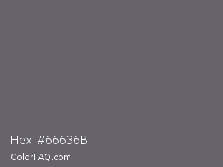 Hex #66636b Color is a normal violet color and the nearest color is Granite Gray #676767. Hex code #66636b and RGB value is rgb(102,99,107). In RGB color space, this color is composed of 40% red, 39% green, 42% blue, In CMYK color space, this color is composed of 5% cyan, 7% magenta, 0% yellow , 58% black , In HSL color space, this color has a hue angle of 263° , 4% saturation and 40% lightness.