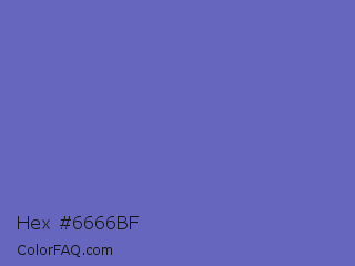 Hex #6666bf Color is a normal blue color and the nearest color is Toolbox #746cc0. Hex code #6666bf and RGB value is rgb(102,102,191). In RGB color space, this color is composed of 40% red, 40% green, 75% blue, In CMYK color space, this color is composed of 47% cyan, 47% magenta, 0% yellow , 25% black , In HSL color space, this color has a hue angle of 240° , 41% saturation and 57% lightness.