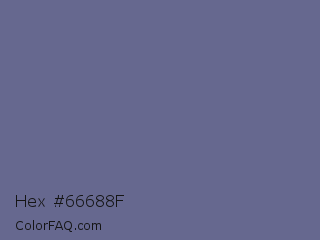 Hex #66688f Color is a normal blue color and the nearest color is Dark Blue Gray #666699. Hex code #66688f and RGB value is rgb(102,104,143). In RGB color space, this color is composed of 40% red, 41% green, 56% blue, In CMYK color space, this color is composed of 29% cyan, 27% magenta, 0% yellow , 44% black , In HSL color space, this color has a hue angle of 237° , 17% saturation and 48% lightness.