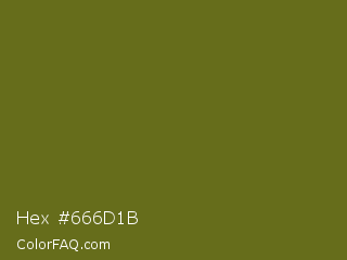 Hex #666d1b Color is a dark yellow color and the nearest color is Fern Frond #657220. Hex code #666d1b and RGB value is rgb(102,109,27). In RGB color space, this color is composed of 40% red, 43% green, 11% blue, In CMYK color space, this color is composed of 6% cyan, 0% magenta, 75% yellow , 57% black , In HSL color space, this color has a hue angle of 65° , 60% saturation and 27% lightness.