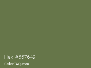 Hex #667649 Color is a normal green color and the nearest color is Dingley #5d7747. Hex code #667649 and RGB value is rgb(102,118,73). In RGB color space, this color is composed of 40% red, 46% green, 29% blue, In CMYK color space, this color is composed of 14% cyan, 0% magenta, 38% yellow , 54% black , In HSL color space, this color has a hue angle of 81° , 24% saturation and 37% lightness.