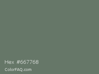 Hex #667768 Color is a normal green color and the nearest color is Corduroy #606e68. Hex code #667768 and RGB value is rgb(102,119,104). In RGB color space, this color is composed of 40% red, 47% green, 41% blue, In CMYK color space, this color is composed of 14% cyan, 0% magenta, 13% yellow , 53% black , In HSL color space, this color has a hue angle of 127° , 8% saturation and 43% lightness.