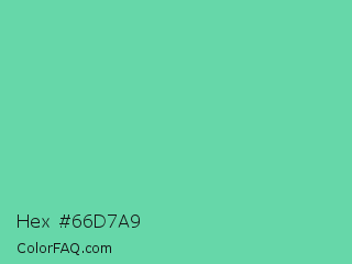 Hex #66d7a9 Color is a light green color and the nearest color is Medium Aquamarine #66ddaa. Hex code #66d7a9 and RGB value is rgb(102,215,169). In RGB color space, this color is composed of 40% red, 84% green, 66% blue, In CMYK color space, this color is composed of 53% cyan, 0% magenta, 21% yellow , 16% black , In HSL color space, this color has a hue angle of 156° , 59% saturation and 62% lightness.