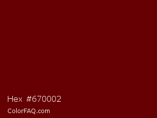 Hex #670002 Color is a very dark red color and the nearest color is Lonestar #6d0101. Hex code #670002 and RGB value is rgb(103,0,2). In RGB color space, this color is composed of 40% red, 0% green, 1% blue, In CMYK color space, this color is composed of 0% cyan, 100% magenta, 98% yellow , 60% black , In HSL color space, this color has a hue angle of 359° , 100% saturation and 20% lightness.
