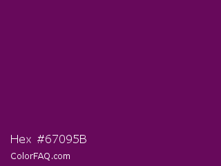 Hex #67095b Color is a very dark magenta color and the nearest color is Pompadour #660045. Hex code #67095b and RGB value is rgb(103,9,91). In RGB color space, this color is composed of 40% red, 4% green, 36% blue, In CMYK color space, this color is composed of 0% cyan, 91% magenta, 12% yellow , 60% black , In HSL color space, this color has a hue angle of 308° , 84% saturation and 22% lightness.
