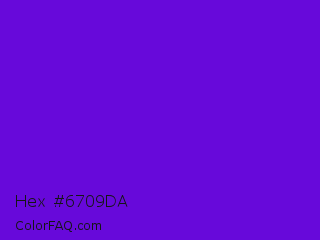 Hex #6709da Color is a normal violet color and the nearest color is French Violet #8806ce. Hex code #6709da and RGB value is rgb(103,9,218). In RGB color space, this color is composed of 40% red, 4% green, 85% blue, In CMYK color space, this color is composed of 53% cyan, 96% magenta, 0% yellow , 15% black , In HSL color space, this color has a hue angle of 267° , 92% saturation and 45% lightness.