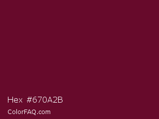Hex #670a2b Color is a very dark rose color and the nearest color is Black Rose #67032d. Hex code #670a2b and RGB value is rgb(103,10,43). In RGB color space, this color is composed of 40% red, 4% green, 17% blue, In CMYK color space, this color is composed of 0% cyan, 90% magenta, 58% yellow , 60% black , In HSL color space, this color has a hue angle of 339° , 82% saturation and 22% lightness.