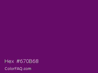 Hex #670b68 Color is a dark magenta color and the nearest color is Midnight #702670. Hex code #670b68 and RGB value is rgb(103,11,104). In RGB color space, this color is composed of 40% red, 4% green, 41% blue, In CMYK color space, this color is composed of 1% cyan, 89% magenta, 0% yellow , 59% black , In HSL color space, this color has a hue angle of 299° , 81% saturation and 23% lightness.