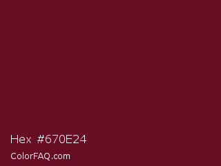 Hex #670e24 Color is a dark red color and the nearest color is Black Rose #67032d. Hex code #670e24 and RGB value is rgb(103,14,36). In RGB color space, this color is composed of 40% red, 5% green, 14% blue, In CMYK color space, this color is composed of 0% cyan, 86% magenta, 65% yellow , 60% black , In HSL color space, this color has a hue angle of 345° , 76% saturation and 23% lightness.