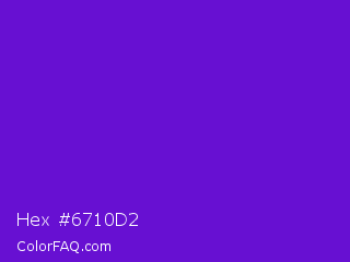 Hex #6710d2 Color is a normal violet color and the nearest color is Purple Heart Crayola #652dc1. Hex code #6710d2 and RGB value is rgb(103,16,210). In RGB color space, this color is composed of 40% red, 6% green, 82% blue, In CMYK color space, this color is composed of 51% cyan, 92% magenta, 0% yellow , 18% black , In HSL color space, this color has a hue angle of 267° , 86% saturation and 44% lightness.