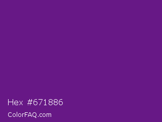 Hex #671886 Color is a normal purple color and the nearest color is Seance #731e8f. Hex code #671886 and RGB value is rgb(103,24,134). In RGB color space, this color is composed of 40% red, 9% green, 53% blue, In CMYK color space, this color is composed of 23% cyan, 82% magenta, 0% yellow , 47% black , In HSL color space, this color has a hue angle of 283° , 70% saturation and 31% lightness.