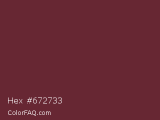 Hex #672733 Color is a dark red color and the nearest color is Buccaneer #622f30. Hex code #672733 and RGB value is rgb(103,39,51). In RGB color space, this color is composed of 40% red, 15% green, 20% blue, In CMYK color space, this color is composed of 0% cyan, 62% magenta, 50% yellow , 60% black , In HSL color space, this color has a hue angle of 349° , 45% saturation and 28% lightness.