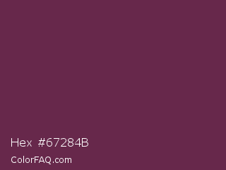 Hex #67284b Color is a dark magenta color and the nearest color is Tawny Port #692545. Hex code #67284b and RGB value is rgb(103,40,75). In RGB color space, this color is composed of 40% red, 16% green, 29% blue, In CMYK color space, this color is composed of 0% cyan, 61% magenta, 27% yellow , 60% black , In HSL color space, this color has a hue angle of 327° , 44% saturation and 28% lightness.