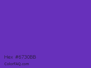 Hex #6730bb Color is a normal violet color and the nearest color is Purple Heart Crayola #652dc1. Hex code #6730bb and RGB value is rgb(103,48,187). In RGB color space, this color is composed of 40% red, 19% green, 73% blue, In CMYK color space, this color is composed of 45% cyan, 74% magenta, 0% yellow , 27% black , In HSL color space, this color has a hue angle of 264° , 59% saturation and 46% lightness.
