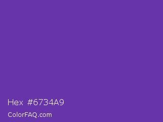Hex #6734a9 Color is a normal violet color and the nearest color is Grape #6f2da8. Hex code #6734a9 and RGB value is rgb(103,52,169). In RGB color space, this color is composed of 40% red, 20% green, 66% blue, In CMYK color space, this color is composed of 39% cyan, 69% magenta, 0% yellow , 34% black , In HSL color space, this color has a hue angle of 266° , 53% saturation and 43% lightness.