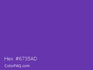Hex #6735ad Color is a normal violet color and the nearest color is Grape #6f2da8. Hex code #6735ad and RGB value is rgb(103,53,173). In RGB color space, this color is composed of 40% red, 21% green, 68% blue, In CMYK color space, this color is composed of 40% cyan, 69% magenta, 0% yellow , 32% black , In HSL color space, this color has a hue angle of 265° , 53% saturation and 44% lightness.