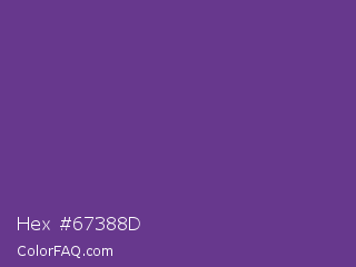 Hex #67388d Color is a normal purple color and the nearest color is Rebecca Purple #663399. Hex code #67388d and RGB value is rgb(103,56,141). In RGB color space, this color is composed of 40% red, 22% green, 55% blue, In CMYK color space, this color is composed of 27% cyan, 60% magenta, 0% yellow , 45% black , In HSL color space, this color has a hue angle of 273° , 43% saturation and 39% lightness.