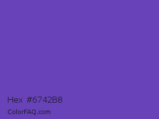 Hex #6742b8 Color is a normal indigo color and the nearest color is Studio #714ab2. Hex code #6742b8 and RGB value is rgb(103,66,184). In RGB color space, this color is composed of 40% red, 26% green, 72% blue, In CMYK color space, this color is composed of 44% cyan, 64% magenta, 0% yellow , 28% black , In HSL color space, this color has a hue angle of 259° , 47% saturation and 49% lightness.