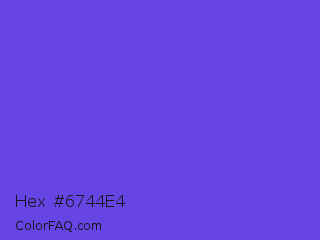 Hex #6744e4 Color is a normal indigo color and the nearest color is Majorelle Blue #6050dc. Hex code #6744e4 and RGB value is rgb(103,68,228). In RGB color space, this color is composed of 40% red, 27% green, 89% blue, In CMYK color space, this color is composed of 55% cyan, 70% magenta, 0% yellow , 11% black , In HSL color space, this color has a hue angle of 253° , 75% saturation and 58% lightness.