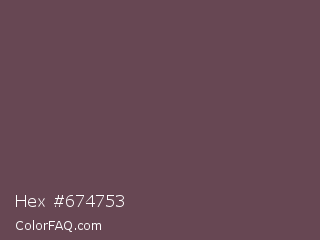 Hex #674753 Color is a normal rose color and the nearest color is Deep Tuscan Red #66424d. Hex code #674753 and RGB value is rgb(103,71,83). In RGB color space, this color is composed of 40% red, 28% green, 33% blue, In CMYK color space, this color is composed of 0% cyan, 31% magenta, 19% yellow , 60% black , In HSL color space, this color has a hue angle of 338° , 18% saturation and 34% lightness.