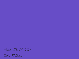 Hex #674dc7 Color is a normal indigo color and the nearest color is Slate Blue #6a5acd. Hex code #674dc7 and RGB value is rgb(103,77,199). In RGB color space, this color is composed of 40% red, 30% green, 78% blue, In CMYK color space, this color is composed of 48% cyan, 61% magenta, 0% yellow , 22% black , In HSL color space, this color has a hue angle of 253° , 52% saturation and 54% lightness.