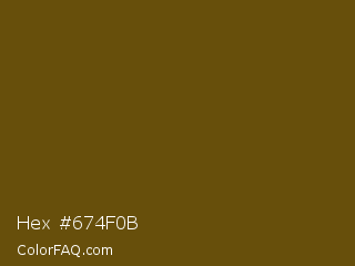 Hex #674f0b Color is a very dark orange color and the nearest color is Antique Bronze #704a07. Hex code #674f0b and RGB value is rgb(103,79,11). In RGB color space, this color is composed of 40% red, 31% green, 4% blue, In CMYK color space, this color is composed of 0% cyan, 23% magenta, 89% yellow , 60% black , In HSL color space, this color has a hue angle of 44° , 81% saturation and 22% lightness.