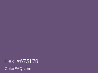 Hex #675178 Color is a normal purple color and the nearest color is Smoky #605b73. Hex code #675178 and RGB value is rgb(103,81,120). In RGB color space, this color is composed of 40% red, 32% green, 47% blue, In CMYK color space, this color is composed of 14% cyan, 33% magenta, 0% yellow , 53% black , In HSL color space, this color has a hue angle of 274° , 19% saturation and 39% lightness.
