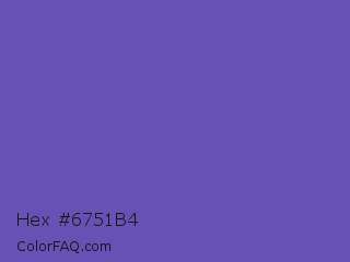 Hex #6751b4 Color is a normal indigo color and the nearest color is Blue Violet #6456b7. Hex code #6751b4 and RGB value is rgb(103,81,180). In RGB color space, this color is composed of 40% red, 32% green, 71% blue, In CMYK color space, this color is composed of 43% cyan, 55% magenta, 0% yellow , 29% black , In HSL color space, this color has a hue angle of 253° , 40% saturation and 51% lightness.