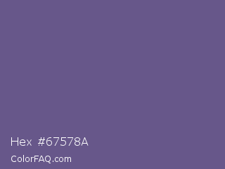 Hex #67578a Color is a normal indigo color and the nearest color is Dark Lavender #734f96. Hex code #67578a and RGB value is rgb(103,87,138). In RGB color space, this color is composed of 40% red, 34% green, 54% blue, In CMYK color space, this color is composed of 25% cyan, 37% magenta, 0% yellow , 46% black , In HSL color space, this color has a hue angle of 259° , 23% saturation and 44% lightness.