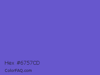 Hex #6757cd Color is a normal indigo color and the nearest color is Slate Blue #6a5acd. Hex code #6757cd and RGB value is rgb(103,87,205). In RGB color space, this color is composed of 40% red, 34% green, 80% blue, In CMYK color space, this color is composed of 50% cyan, 58% magenta, 0% yellow , 20% black , In HSL color space, this color has a hue angle of 248° , 54% saturation and 57% lightness.